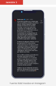 En las últimas semanas, se ha apreciado en redes sociales una tendencia a tomar posicionamiento político, especialmente entre cantantes y artistas con influencia en públicos más jóvenes. Así, a Pablo Chill-E, se han sumado cantantes como Princesa Alba (760 mil seguidores en Instagram) (ver imagen 2) y Kidd Voodoo (973 mil seguidores en Instagram). En particular, hace unas semanas este cantante fue interpelado por sus seguidores en Instagram a tomar una postura frente a las elecciones del próximo domingo, respondió directamente a una seguidora y por la misma vía, aunque sin mencionar al candidato de su preferencia (Imagen 3).