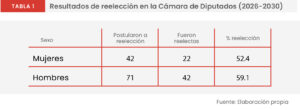 El análisis de la reelección muestra diferencias moderadas entre mujeres y hombres. De las 42 diputadas que buscaron renovar su periodo, 22 lo consiguieron. Esto equivale al 52%. En cambio, de los 71 candidatos, solo 42 mantuvieron su escaño, consiguiendo un 59% de reelección. Esta brecha, de siete puntos porcentuales, indica que la reelección favoreció ligeramente más a los hombres en este ciclo electoral. Si bien la literatura ha documentado que diversos factores, como la trayectoria previa, las redes territoriales y la visibilidad política, pueden influir en estos resultados (Franceschet y Piscopo, 2014; Piscopo et al, 2024), la evidencia del ciclo 2026-2030 permite señalar únicamente que las diferencias existen pero no son de gran magnitud y se mantienen dentro de rangos observados en otros contextos comparables.