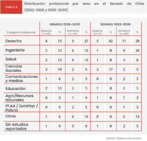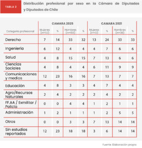 En cuanto a las profesiones, las integrantes de la Cámara de Diputadas y Diputados, para el periodo 2022-2026 se distribuían entre profesiones como el derecho, la salud, las comunicaciones y ocupaciones técnicas, mientras que los hombres se concentraban fuertemente en el derecho (33%) y en diversas ingenierías. Para la Cámara Baja del periodo 2026-2030, las mujeres presentan una composición más heterogénea, con mayor presencia en ingeniería, ciencias sociales, comunicaciones y agro, mientras que los hombres mantienen la primacía del derecho, pero aumentan levemente las ingenierías, las comunicaciones y los perfiles técnicos.