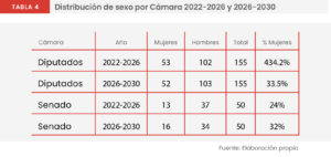 Este marco conceptual permite analizar de manera más precisa la composición del Congreso correspondiente al periodo 2026-2030. En el Senado, la representación femenina aumenta significativamente, pasando de 12 mujeres electas en 2021 a 16 en 2025. En contraste, la Cámara de Diputadas y Diputados mantiene prácticamente la misma proporción. Estas cifras, no obstante, no evidencian necesariamente un fortalecimiento equivalente de las oportunidades de acceso a cupos competitivos ni una mejora en las condiciones de permanencia institucional de las mujeres, manteniendo la representación femenina en la cámara baja apenas por sobre el treinta por ciento.