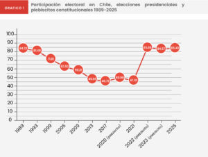 ¿Qué hicimos mal? La decisión de inscribir automáticamente a todos los chilenos de 18 años y más en el padrón electoral fue en la dirección correcta. Pero la idea de hacer del voto un acto voluntario se convirtió en la peor medida político-institucional de la que tengamos memoria. En lugar de generar un proceso de incorporación juvenil a las instancias electorales, produjo todo lo contrario. Los jóvenes se aislaron del sistema político, mientras que los desencantados que estaban inscritos en el padrón encontraron la forma de huir. Sin embargo, el estallido social, el proceso de cambio constitucional y la pandemia, modificaron en algo las cosas. En el plebiscito constitucional de 2020, por ejemplo, la participación creció a un 51%, destacando un incremento en la participación juvenil- derivada del estallido social y el cambio constitucional- pero un retroceso en la participación de los votantes más longevos, lo que respondió, en gran parte, al contexto de pandemia. La participación en las elecciones locales de 2021 fue decepcionante, superando apenas el 43%. En estas elecciones también se escogieron los convencionales que redactarían la nueva Constitución. Luego, en las elecciones presidenciales de 2021 la participación apenas creció cuatro puntos respecto a las de 2017. Sólo en la segunda vuelta de 2021 que enfrentó a Gabriel Boric y José Antonio Kast, la participación alcanzó niveles razonables, llegando a un 55.7%.